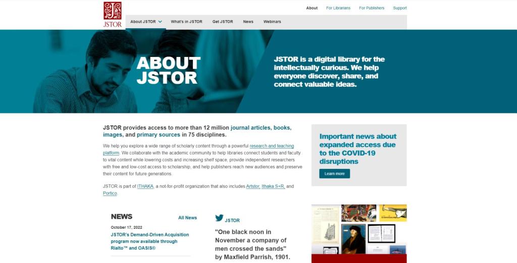 JSTOR全名为Journal Storage,始于1995年美仑基金会对过刊进行数字化的数字典藏项目。该机构有计划地建立核心学术性过刊的数字化存档,以节省图书馆空间,同时提供资料检索的功能,有效提高使用的便利性。目前,JSTOR拥有来自138个国家的4703个参与会员,参与的出版社达533家。JSTOR是以政治学、经济学、哲学、历史学等人文社会学科主题为中心,兼有一般科学性主题共十几个领域的代表性学术期刊的全文库。